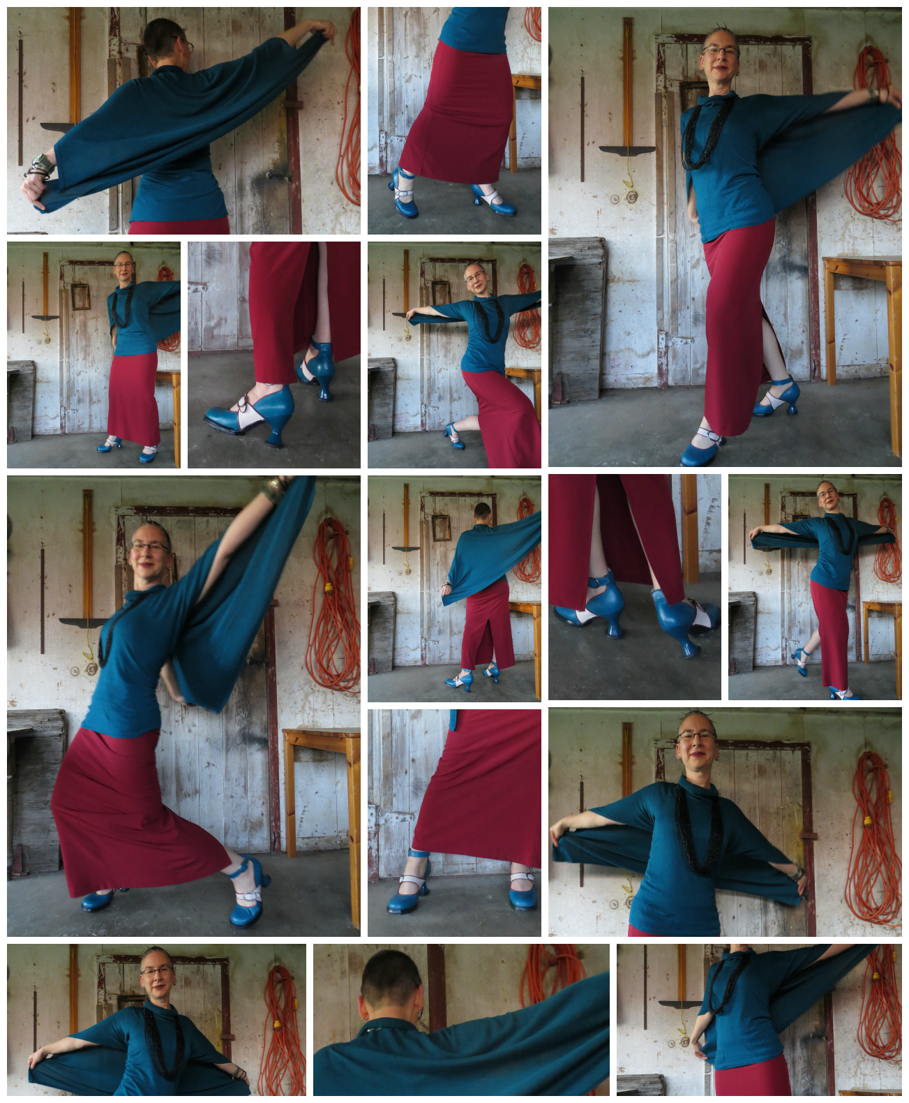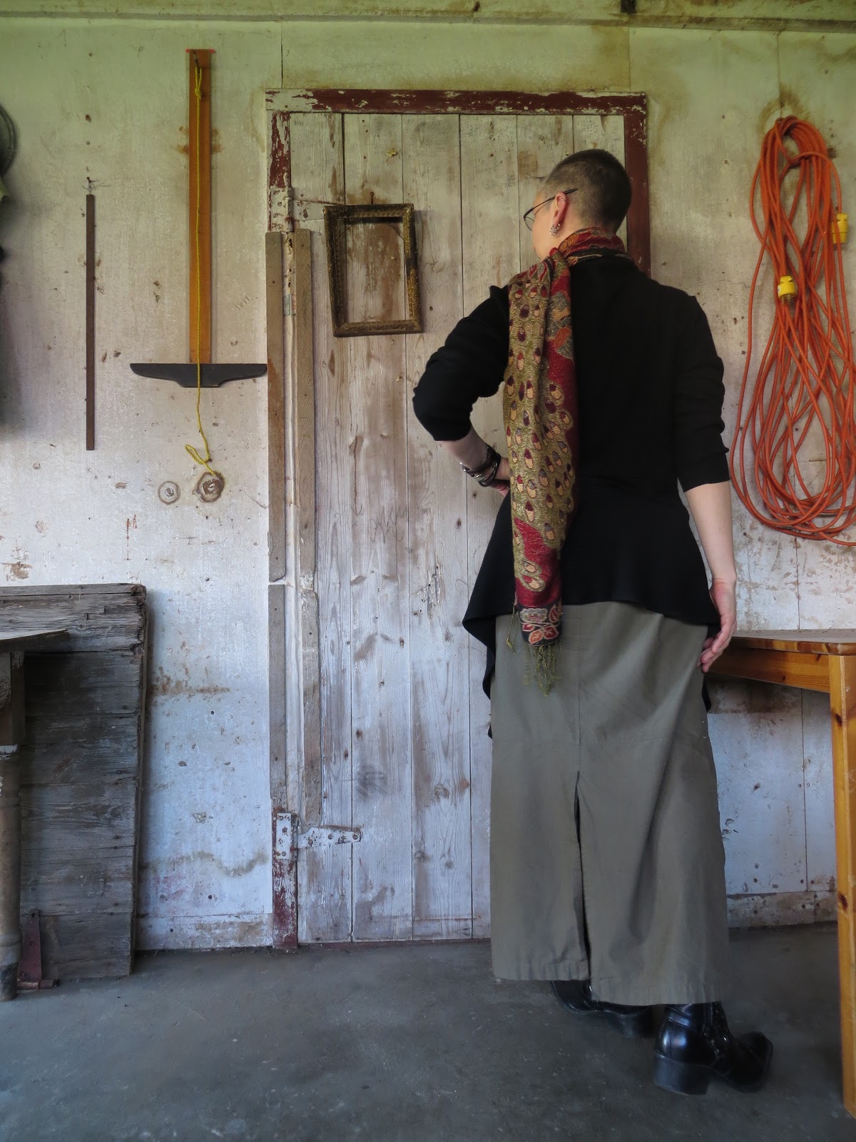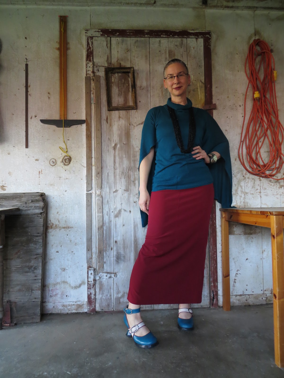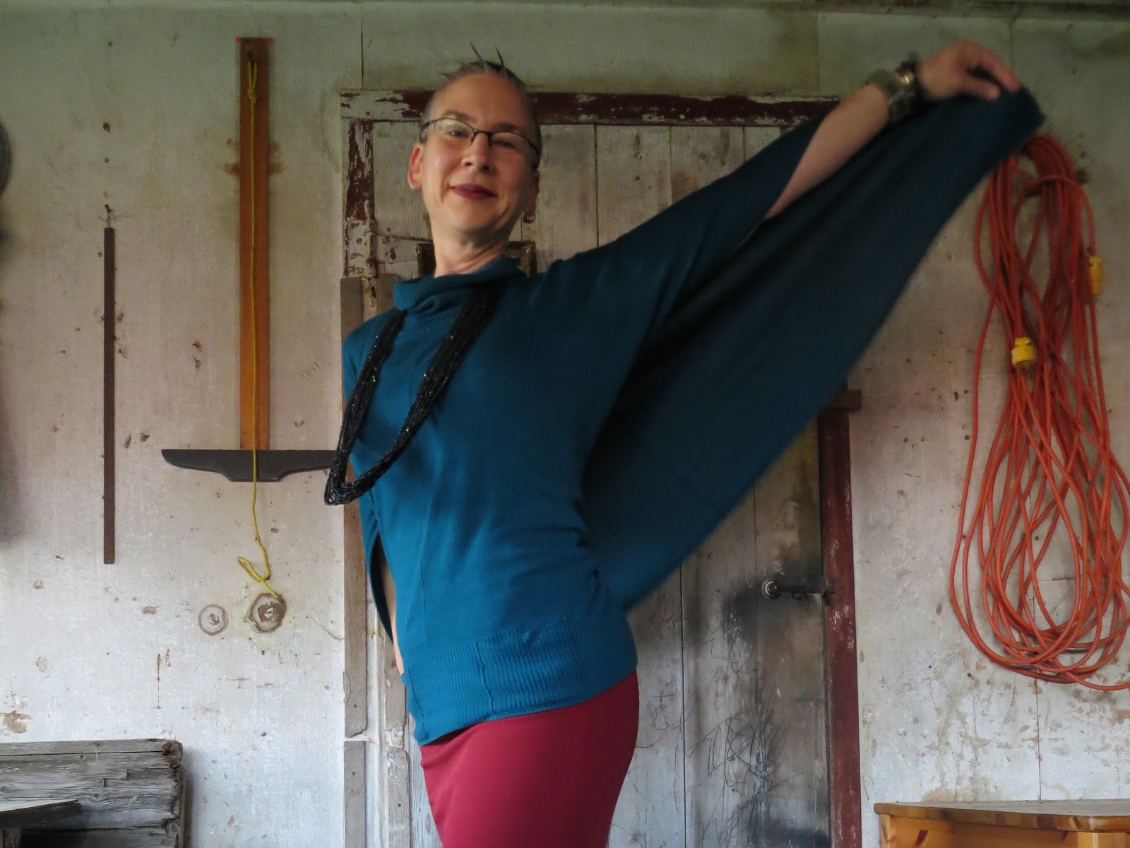 This sweater is such an unusual and puzzling tubular garment, which is why it's my favourite: a cylinder as long as I am tall, vertically slit halfway to create the "sleeves," and at that halfway point opposite the slit appears the cowl/turtleneck. I believe the wee pockets in front are there solely to indicate that there is a "front," which is good to know. Plus it's twirly AND flappy!