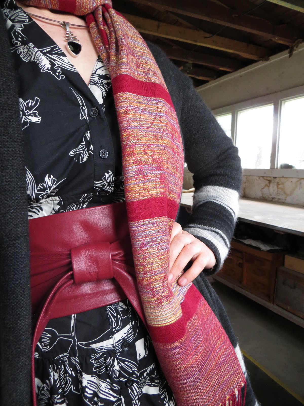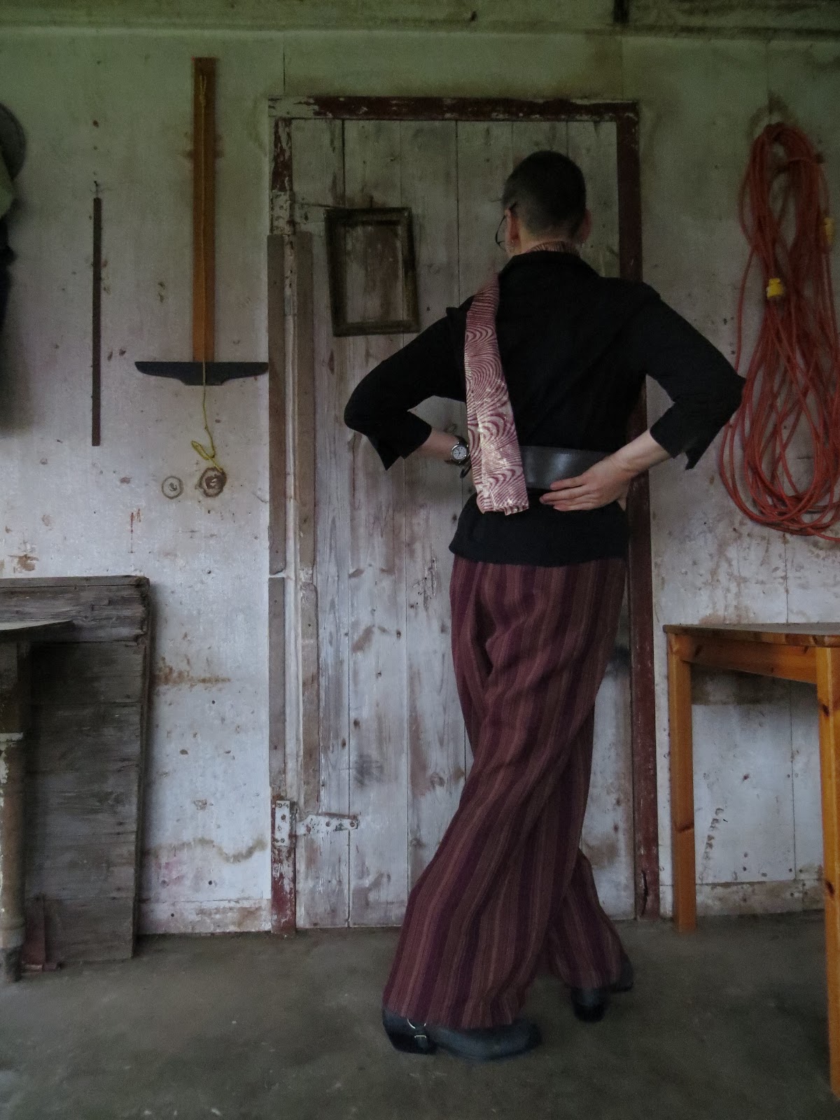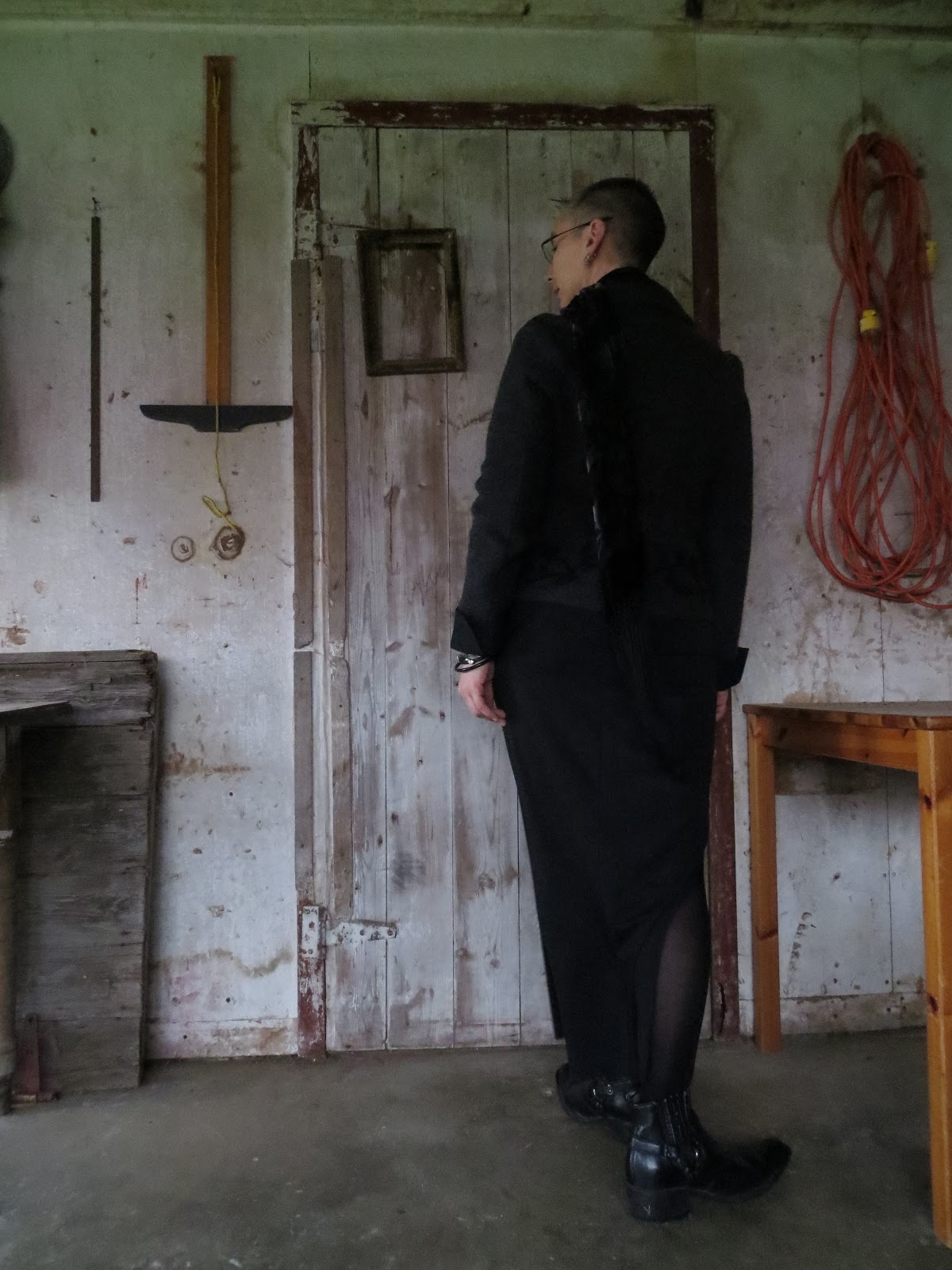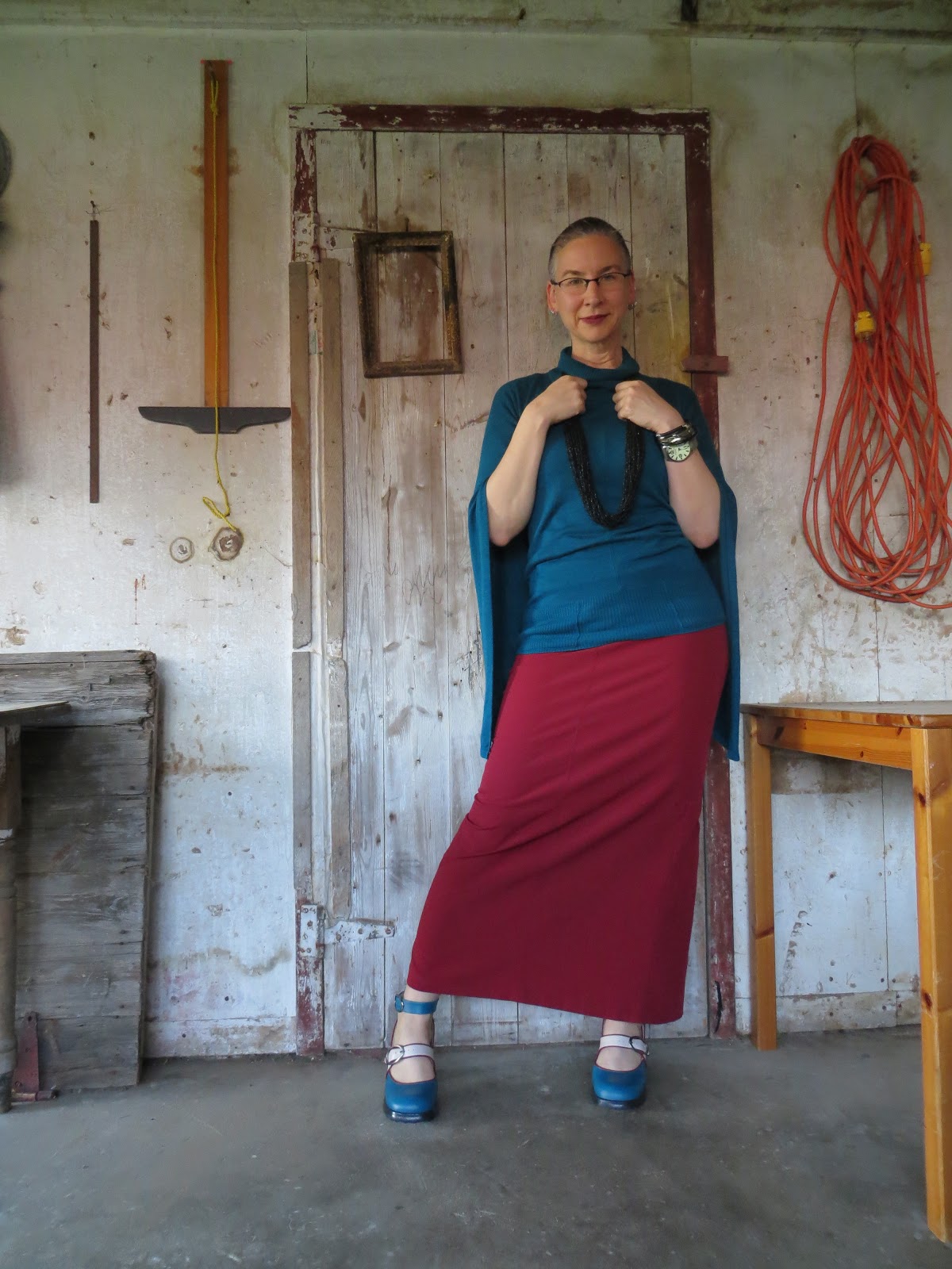 This sweater is such an unusual and puzzling tubular garment, which is why it's my favourite: a cylinder as long as I am tall, vertically slit halfway to create the "sleeves," and at that halfway point opposite the slit appears the cowl/turtleneck. I believe the wee pockets in front are there solely to indicate that there is a "front," which is good to know. Plus it's twirly AND flappy!