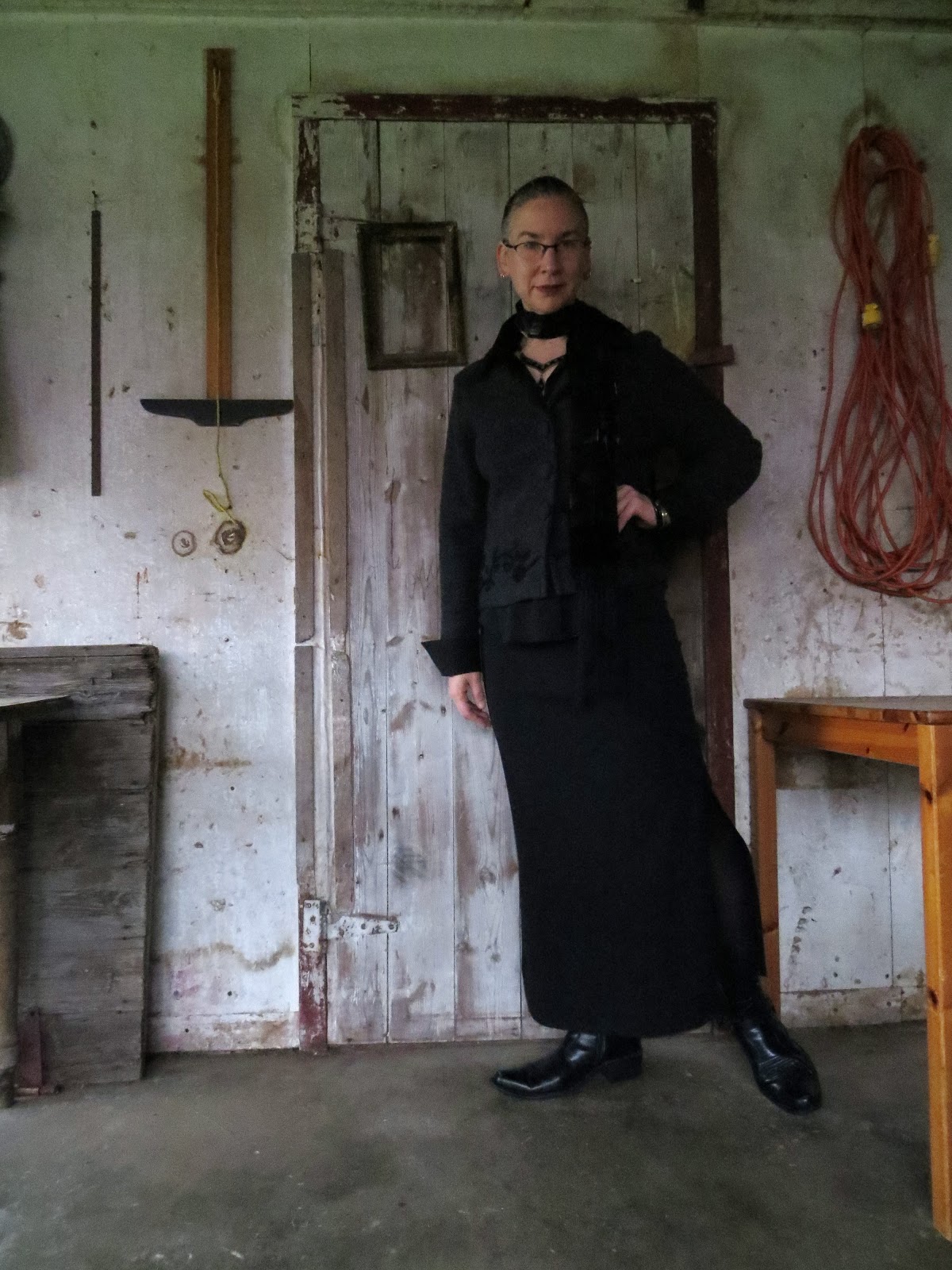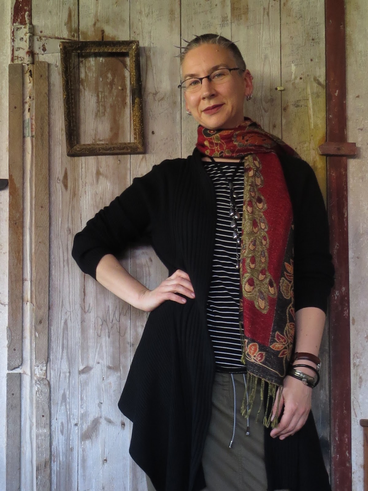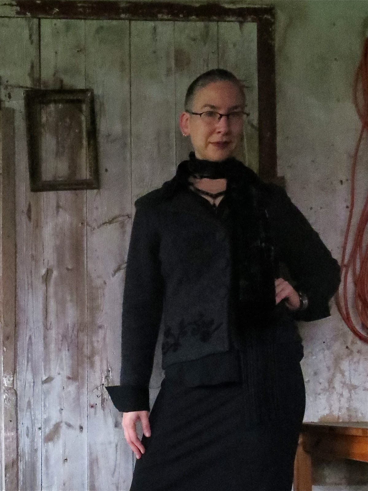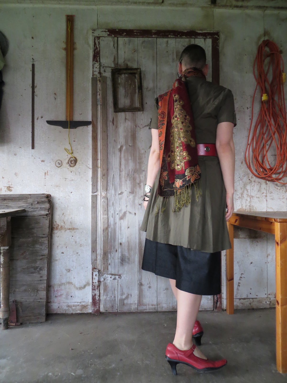 This sweater is such an unusual and puzzling tubular garment, which is why it's my favourite: a cylinder as long as I am tall, vertically slit halfway to create the "sleeves," and at that halfway point opposite the slit appears the cowl/turtleneck. I believe the wee pockets in front are there solely to indicate that there is a "front," which is good to know. Plus it's twirly AND flappy!