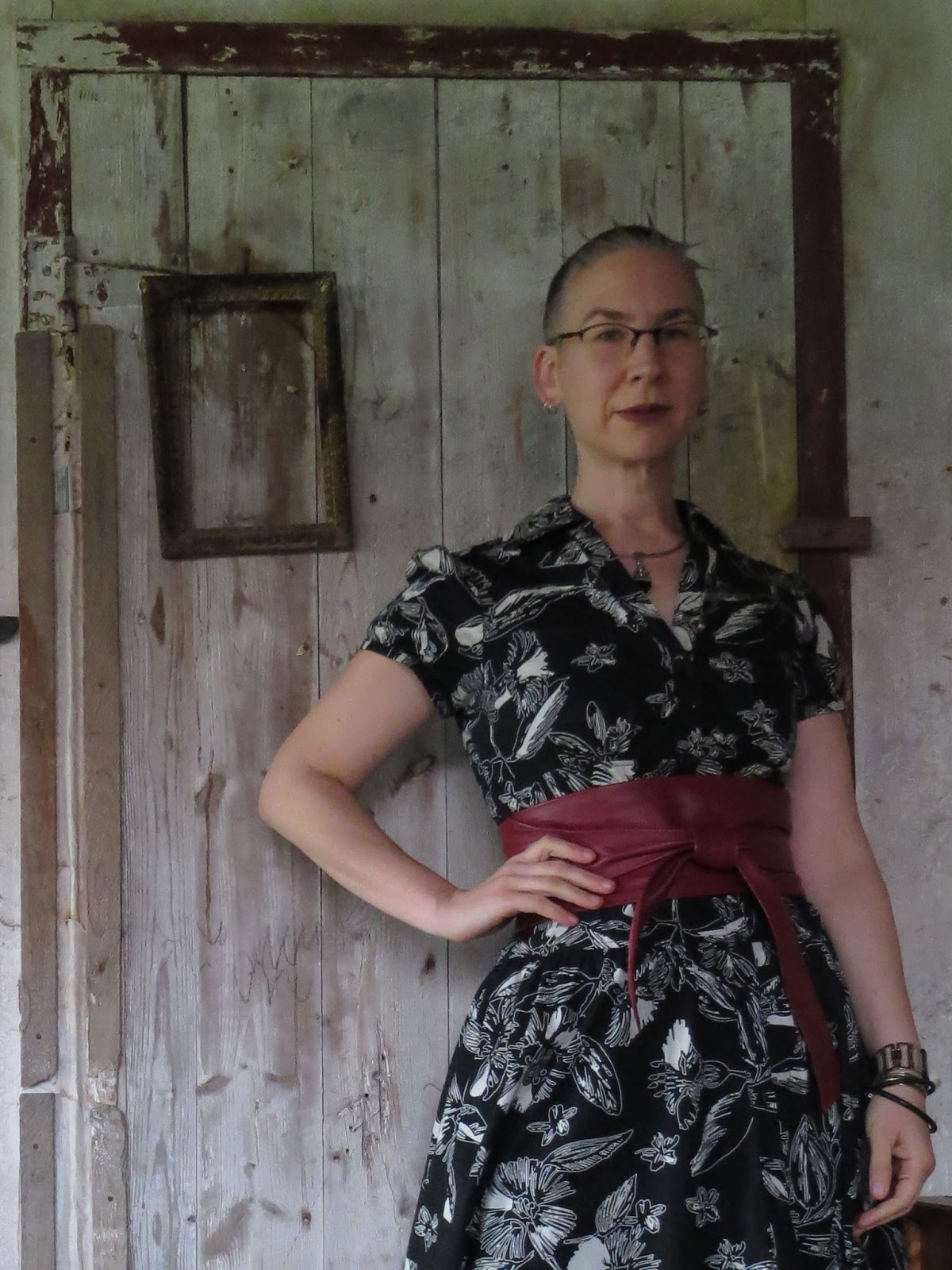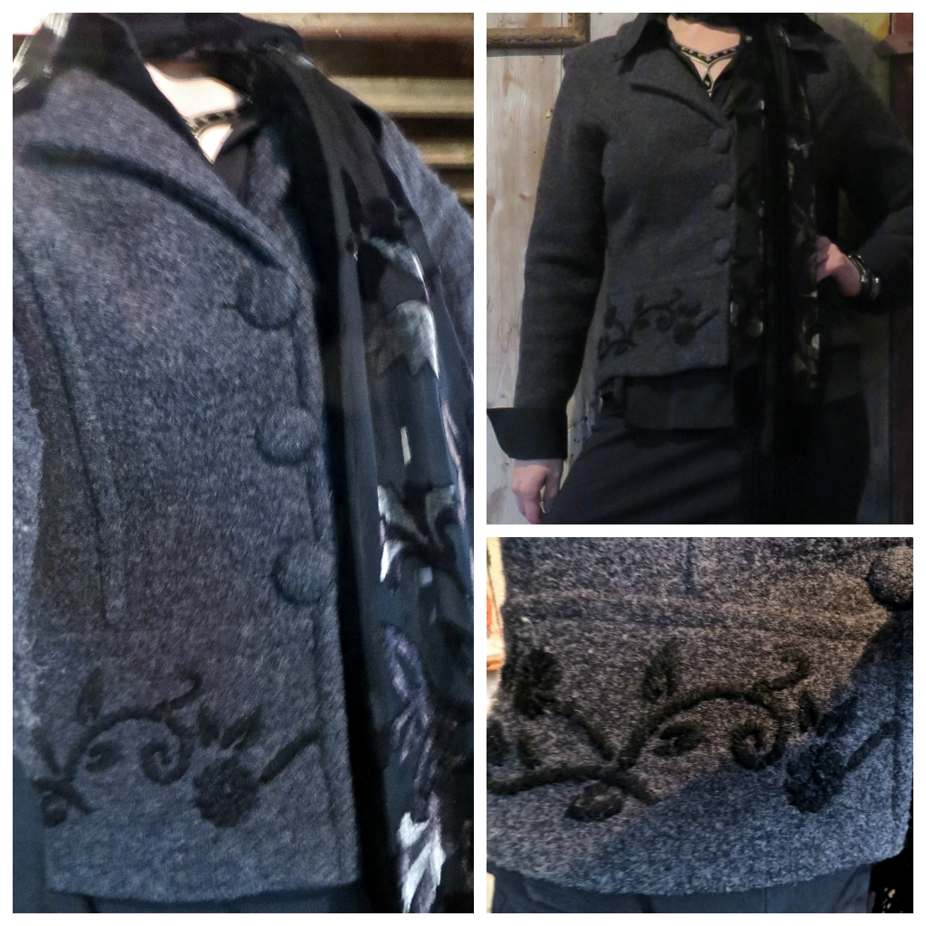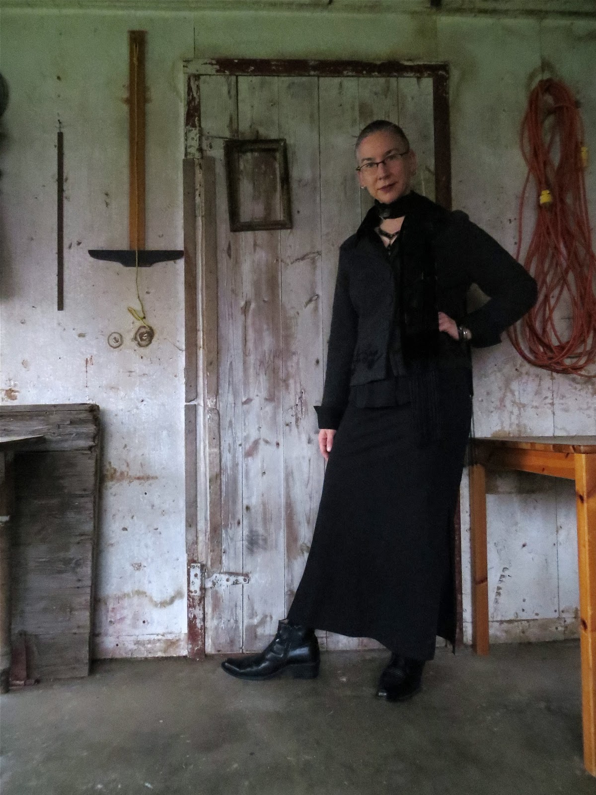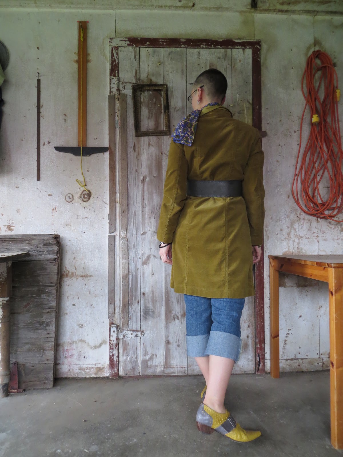 This sweater is such an unusual and puzzling tubular garment, which is why it's my favourite: a cylinder as long as I am tall, vertically slit halfway to create the "sleeves," and at that halfway point opposite the slit appears the cowl/turtleneck. I believe the wee pockets in front are there solely to indicate that there is a "front," which is good to know. Plus it's twirly AND flappy!
