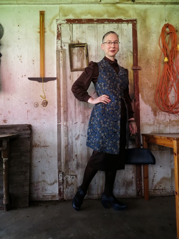 Here I go, hurrying to catch up my backlog of outfit photos to the actual weather with more layers! I've had this beautifully-made vintage vest-dress since last spring and I'm still figuring out just the right things to wear with it.