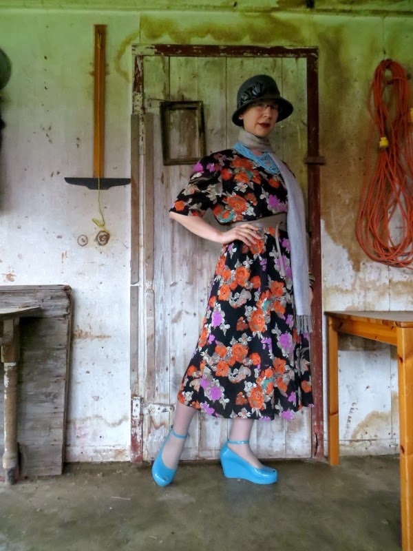Did you know that my favourite evocative adjective "grotty" has its origin in the film A Hard Day's Night, where it is applied by George Harrison to shirts? Fortunately, I did not feel grotty whatsoever in this vintage handmade dress of gossamer-light silk with its tremendous puffed sleeves and fancy bodice-pleat action, rather, I felt quite marvellously "gear".