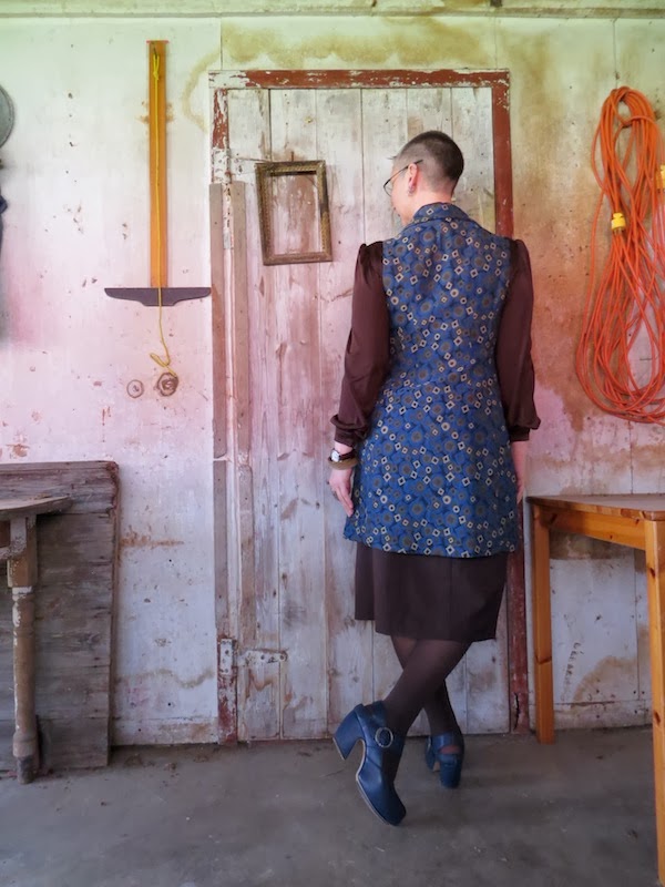 brown vintage blouse: handmade, Netty Vintage blue vintage vest-dress: Monteselli Original by Primrose of Toronto / Reflets de Couture Francaise, Netty Vintage brown midi skirt: Worthington, thrifted blue shoes: Fluevog Prepare Guide, worn here