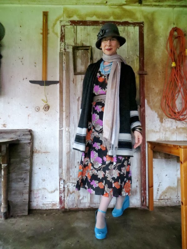 hat: no label, Burlington Coat Factory, worn here scarf: Charming Charlie, worn here sweater: Nurture, Dillard's, worn here blue glass bead necklace: Gabii's (Progreso, TX), worn here vintage floral dress: Nu-Mode Toronto Canada, Netty Vintage $5 dress rack blue ankle-strap wedges: Melissa Toffee Apple, ebay, worn here
