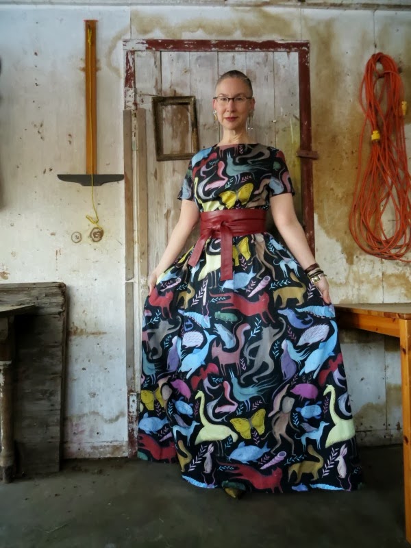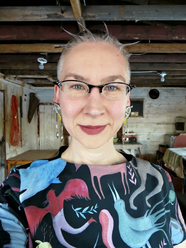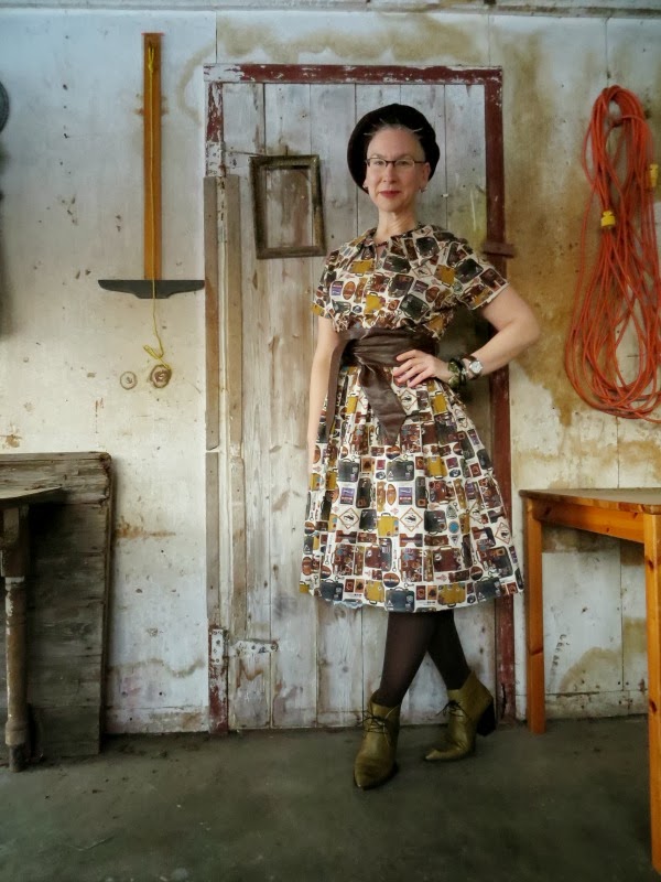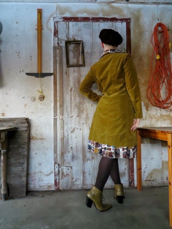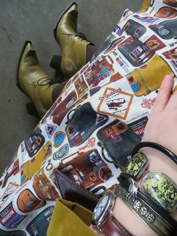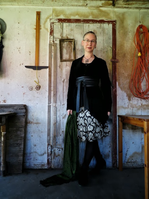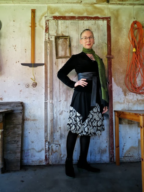 Apologies for these dark photos as we head into longer days. I felt quite festive in this outfit, exposing the skirt's nearly secret bits of blue and green. I'll say more about this latest celebratory footwear next time - better-lit pics are already lined up!