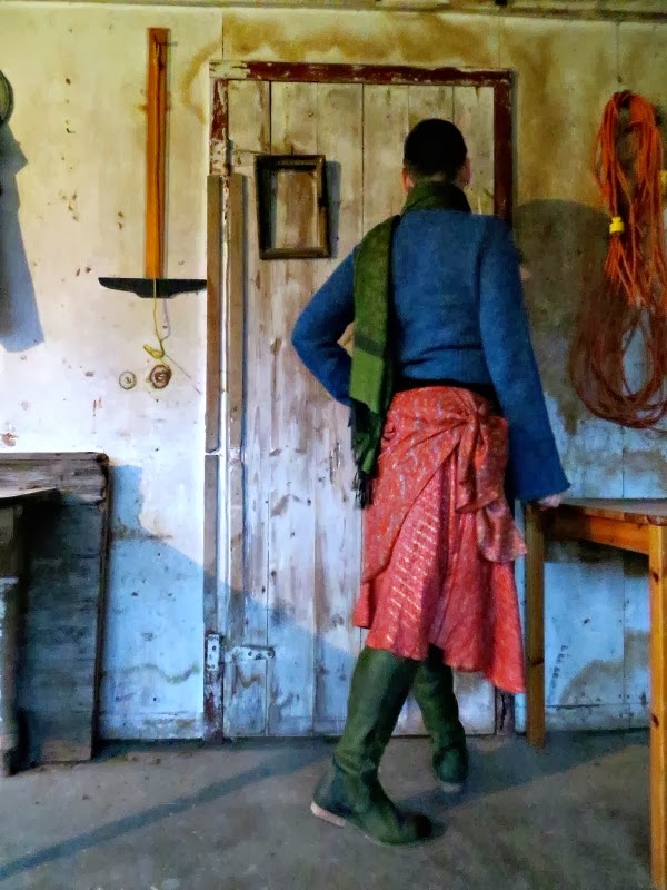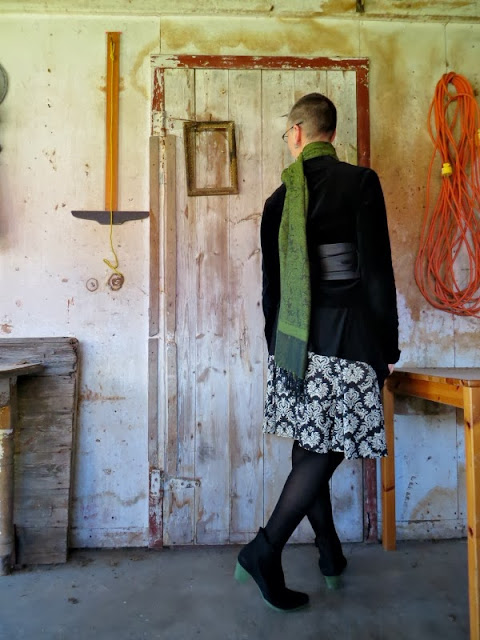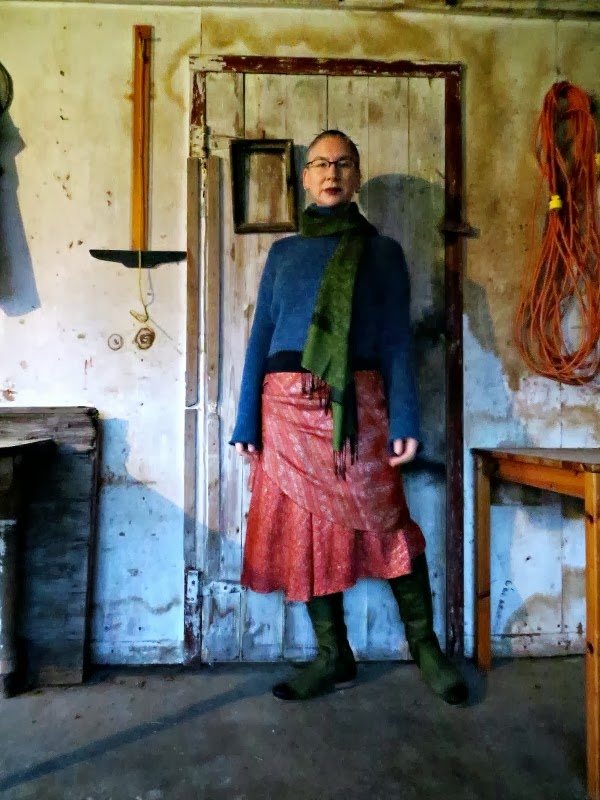 | green scarf: Lupita's (Harlingen, TX), worn here blue wool/synthetic blend turtleneck sweater with flared sleeves: Tommy Hilfiger Denim, local discount / overstock store black tank top: Vanderbilt, Zellers, 7+ yrs. old silk recycled sari skirt: Alchemy Eco-fashions, The Circle Game, worn here (another favourite outfit) amazing bottle-green boots: Fluevog Radio Ard |